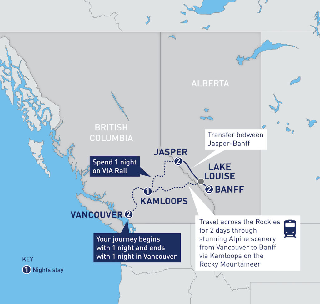 Travel on a roundtrip from Vancouver through the breath-taking landscapes of the Canadian Rockies on this scenic rail journey! Explore Vancouver’s Stanley Park and take a stroll along the sea wall for amazing views looking back at Coal Harbour and the City, venture to Granville Island and the Farmers Market for some local food. Travel the world-famous Rocky Mountaineer as you wind through the Canadian Rockies making your way to the mountainside town of Banff. Venture through Alberta along the Icefields parkway as you make your way to Jasper. Board VIA Rail for your scenic journey back to Vancouver where you pass by Mount Robson, the tallest peak in the Canadian Rockies.