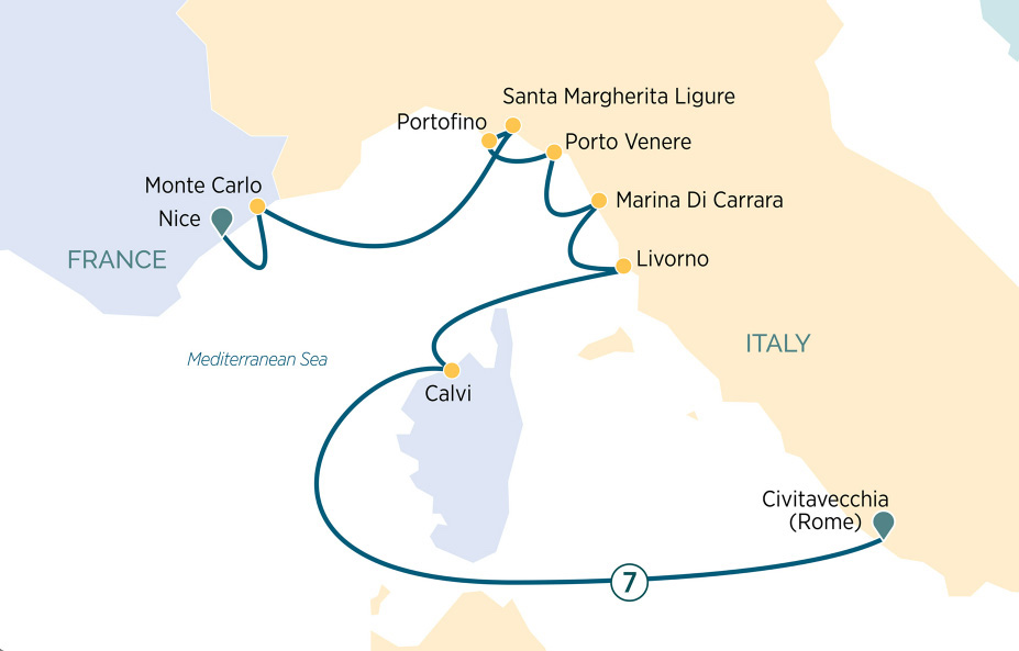 Welcome aboard this luxury 8-day cruise sailing from Italy to the South of France, discovering the coastal charms of the Italian and French rivieras. On this captivating voyage, you can glimpse dramatic coastal cliffs clustered with pastel-hued villas, taste some of the freshest seafood imaginable and soak up the glitz and glamour of the Riviera lifestyle. Among the highlights, stop at an Italian seaside port famed for the region’s prized Carrara marble, peek inside a gothic church perched on a rocky headland and experience the opulence and royal heritage of Monaco. Your unforgettable cruise concludes in Nice, the largest city along the French Riviera.