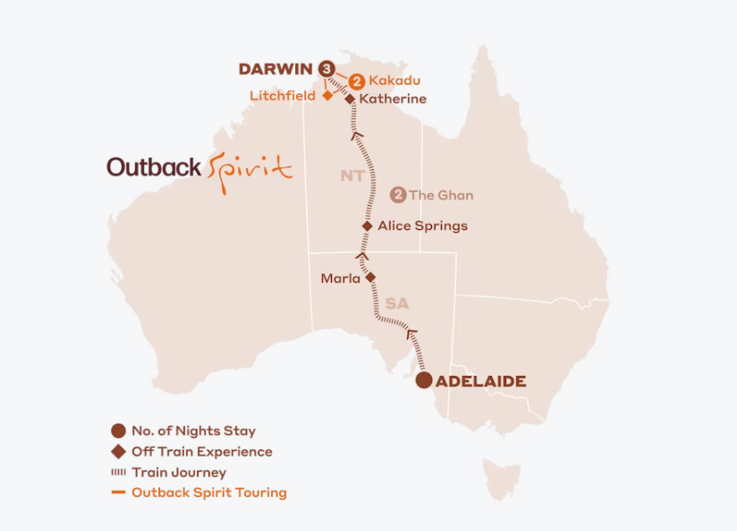 • 2 nights aboard The Ghan, Adelaide to Darwin, including all meals, beverages and Off Train Experiences in Marla, Alice Springs and Katherine