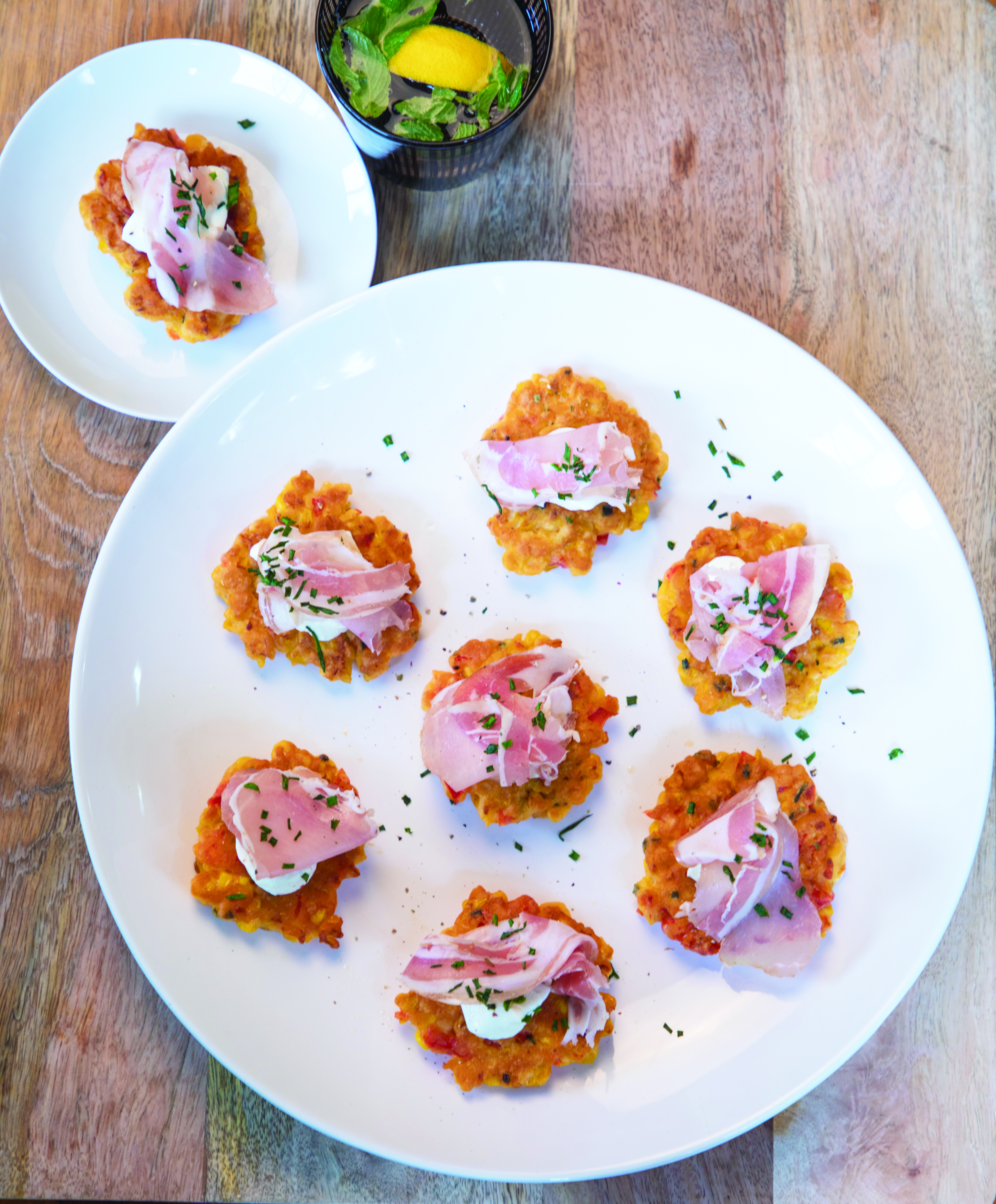 Once cooled, top the fritters with sour cream, pancetta and chives. Season with salt and pepper to taste.