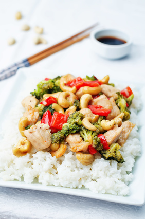 Toss in the broccoli and peppers and cook for 2-3 minutes, or until the vegetables are crisp-tender and the chicken is cooked through. Pour the remaining sauce and add the cashews. Toss everything together and allow the sauce to bubble and thicken. Season with salt, pepper or red pepper chilli flakes as needed.