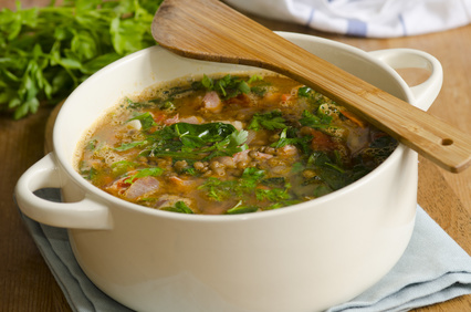 Add the spinach and stir until wilted. Transfer half the soup to a blender and liquidise to make a purée. Stir this back into the soup. Season to taste with lemon juice, salt and ground black pepper.