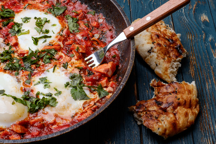 Shakshouka is a form of vegetable ragout made of eggs poached in a sauce of tomatoes, chilli peppers, and onions, often spiced with cumin. Cooked all together in a pan. This is my favourite version, feel free to swap the peppers for one medium eggplant, or two courgettes, or four medium boiled potatoes as desired. For the meat lovers, you can also add some chorizo or bacon after the onions are golden as well.