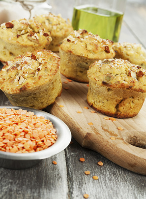 - In a large bowl, whisk together eggs, pumpkin purée, brown sugar, lentil purée, canola oil, apple juice, and vanilla until smooth. In another large bowl, stir together flour, oats, baking powder, baking soda, salt, and spices.