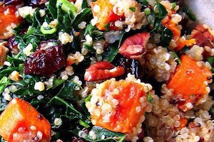 - In a large bowl, toss together the sweet potato, beets, pecans, cranberries, kale and quinoa.