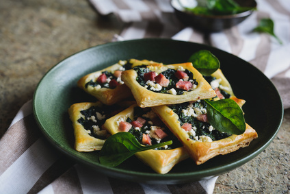 Wilt the spinach in a pan by placing it on a medium element and cooking it gently. Then in a bowl, mix the spinach, feta, garlic, pepper, and nutmeg together.