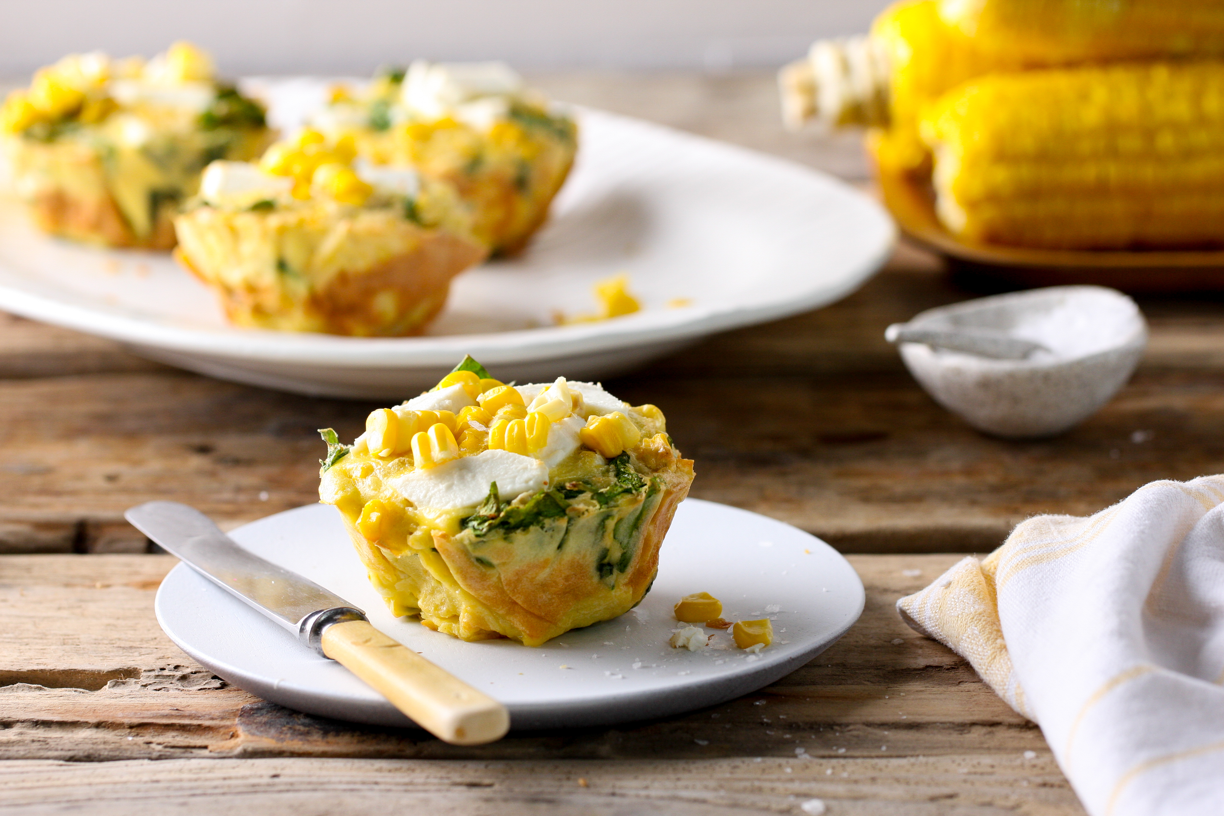 - Layer in the tins the spinach leaves, feta and finish with the corn on top. Pour over the egg mixture to cover the filling.