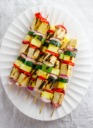 Cut tofu into 3/4 – 1 inch cubes, place in a shallow baking dish and add about 1/3 – 1/2 of the sauce, gently toss to coat tofu, cover and let marinate for at least 30 minutes. Chop and prep the veggies. Thread tofu & veggies on the skewers, distributing evenly, in whatever order you like.