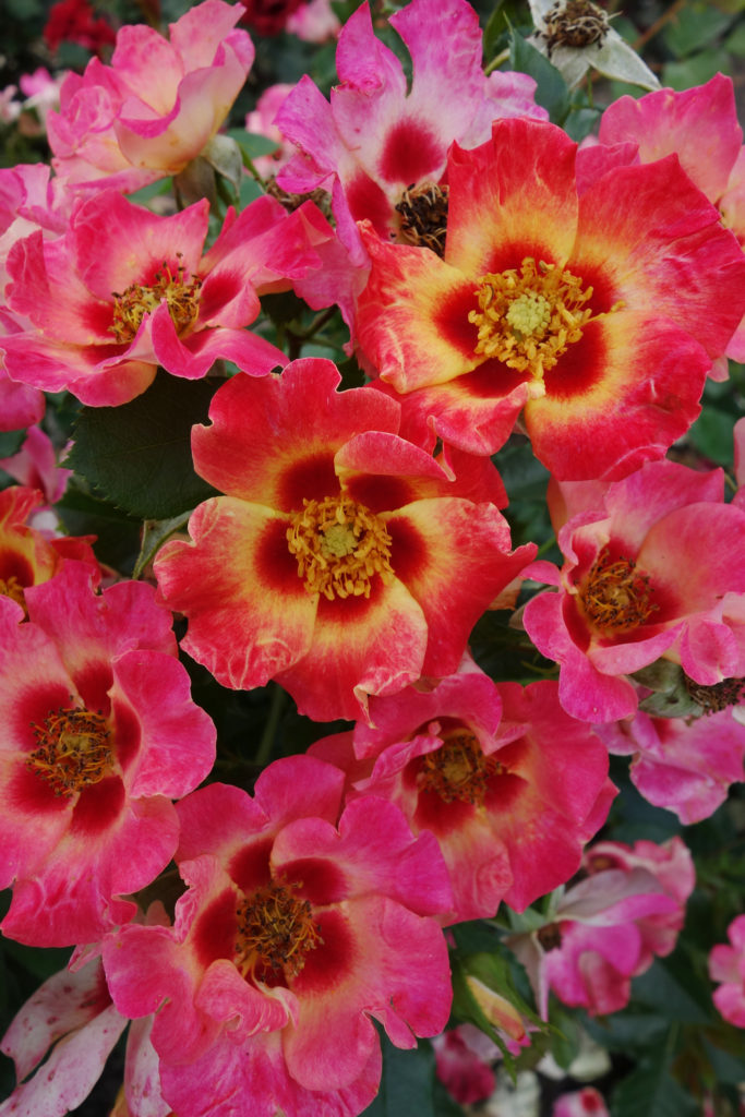 ‘Sweetspot® Calypso’ is an eye catching rose with masses of single blooms of pinkish red and yellow with a pink/red spot in the centre of each petal. The blooms have a moderate scent and are produced freely from mid spring until late autumn. A compact growing plant to 60cm x 60cm with dark green foliage, it is ideal for growing in gardens as well as pots and containers. To perform at its best, it does require a regular spray program.
