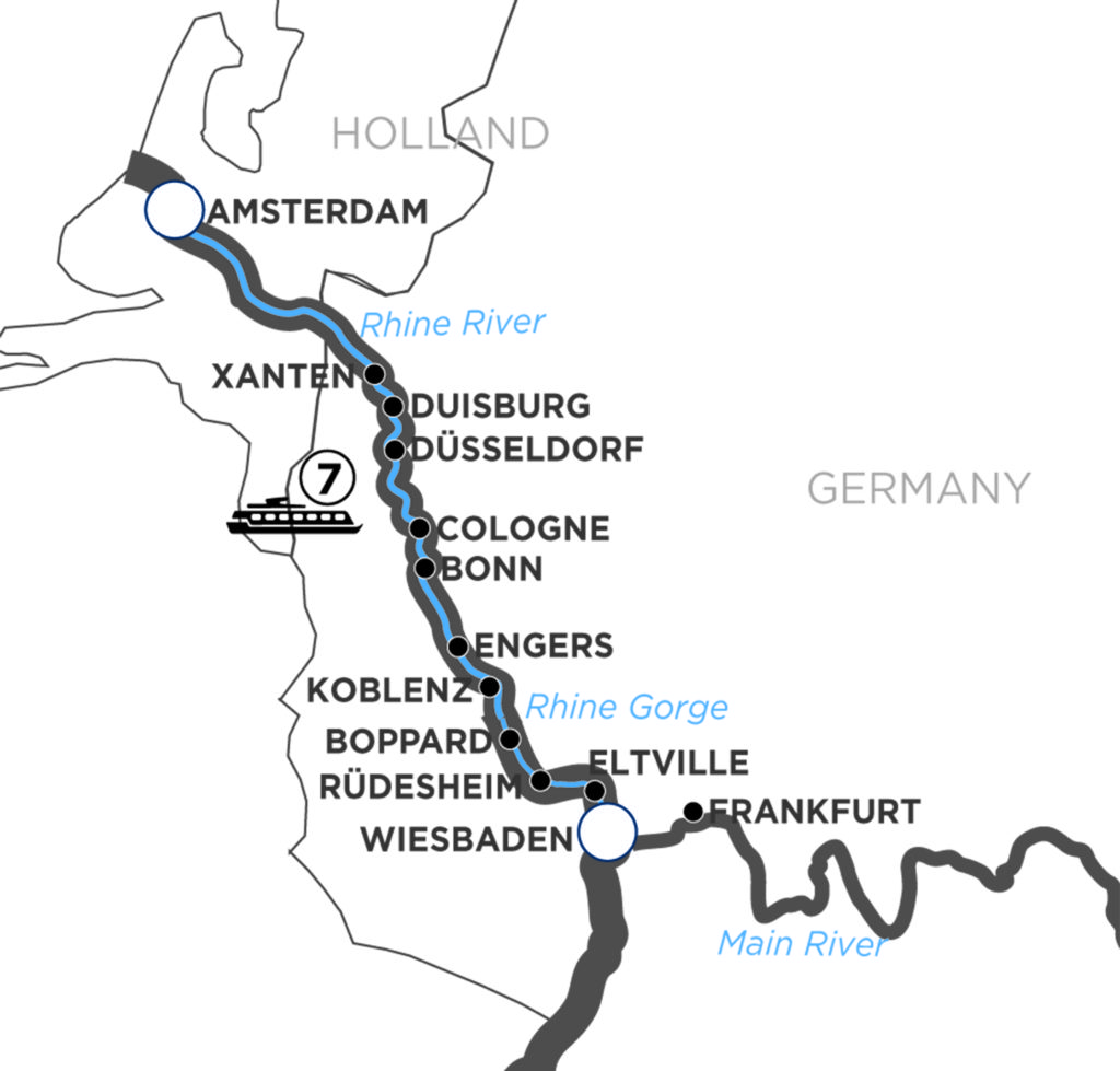 Explore Germany and Holland with a range of inspiring experiences along the Rhine. While in Wiesbaden, join a guided hike on one of the Hike Rheinsteig trails, a guided walk through Eltville am Rhein with a wine tasting, or visit the beautiful Eberbach Monastery. Colourful Amsterdam lets you follow your passions as you are presented with a painting class, a culinary walk with traditional Dutch specialties or a canal cruise along the waterways.