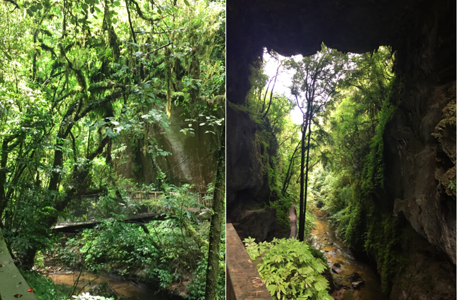 Heading west from Otorohanga, past Waitomo Caves, on a sealed but windy road we stop in a parking bay kilometres from anywhere else. We took the 10-minute walk along the track, wondering what we were going to see other than the beauty of the bush with its variant shades of green. The sunlight shone through the foliage above, dappling the path with patches of light as it followed a stream with water so clear you could count the stones. It wasn’t far, but we stopped to admire this fern and that along the way and crossed the swing bridge. Around an outcrop we saw what we had come to see – the Mangapohue Natural Bridge. High above our heads crossing the stream below was a natural span of rock. Trees, some quite large, grew on top and clung desperately to the edge. There was a slight echo as we climbed the wooden steps that gave us a better view. Photos can’t do it justice, but it was magic spot.