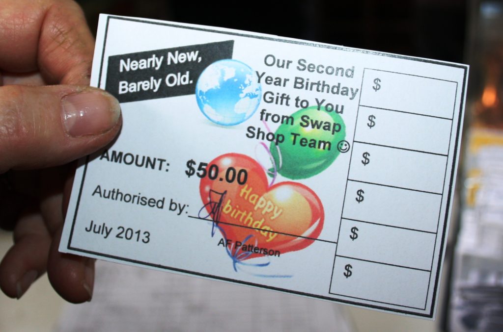 Annette certainly isn’t talking about a trip to the landfill. Instead, ‘sale days’, when goods are ‘half-price’, help shift the excess. There is also an arrangement with local second-hand stores to take larger items that the shop can’t house in return for donations of small items, while celebratory store-birthday vouchers are gifted to shoppers so they can ‘buy’ without having necessarily contributed goods. And if a traveller calls in with nothing to donate but still wants to ‘buy’, Annette is sure to make them welcome all the same.